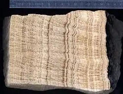 In geology, lamination (from Latin lāmina 'thin layer') is a small-scale sequence of fine layers (pl.: laminae; sg.: lamina) that occurs in sedimentary rocks. Laminae are normally smaller and less pronounced than bedding. Lamination is often regarded as planar structures one centimetre or less in thickness, whereas bedding layers are greater than one centimetre.[1] However, structures from several millimetres to many centimetres have been described as laminae.[2] A single sedimentary rock can have both laminae and beds.