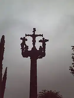 The parish close of Lampaul-Guimiliau commands the road junction at the centre of the village. It is one of the best examples of its kind. It contains not only the church and graveyard of the parish, but also a large and elaborate calvary or crucifix and a noted charnel house, both common features of Breton closes, and a vast belfry. The church and charnel house display a large body of polychrome sculpture, mainly of 16th or 17th century date and rich in complex Christian iconography, reflecting the preoccupations of the Counter-Reformation or Catholic Reformation.