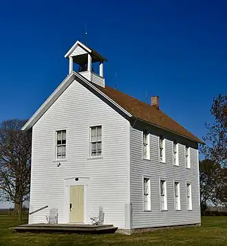 Lancaster School is the last remaining public building in what was the former county seat of Lancaster.[2] It occupies the ground that was the courthouse square. The school was one of six two-story buildings built by the county for educational purposes in the 1870s and early 1880s. They required two teachers, and were therefore more expensive to operate. This building was constructed in 1881 by Reynolds Bros. It replaced a school building that had been built further east in 1874. It is a two-story frame structure that measures 33 by 22 feet (10.1 by 6.7 m).[2] The pedimented entry faces the south, and there is a belfry above the gable. A single classroom is located on the northern two-thirds of both floors. The town of Lancaster at one time had 32 buildings, but it started to decline in the 20th century. Enrollment in the school was 119 in 1898, but fell to about thirty early in the 20th century. When it closed in 1964 there were 13 students enrolled, and by that time they only utilized the first floor. The former school building, one of the churches and a few houses are all that remain of Lancaster. The building has been used in subsequent years as a voting facility. It was listed on the National Register of Historic Places in 1984.[1]