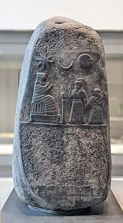 The rounded top, shaped kudurru is covered on three sides by an inscription of Meli–Šipak. On the fourth side, a rectangular recessed scene shows the king dressed in a long robe with his right hand raised in a gesture of greeting. With his left hand, he grasps the wrist of his daughter.[1] The princess carries in her left hand a nine-stringed harp. Both face an enthroned goddess (Nanaya, a deity worshipped especially at Uruk[2]) who is dressed in a flounced or segmented garment and donning a feathered mitre and sits on the far side of a cultic censer (inscribed: NÍG.NA; Akkadian: nignakku) on a stand.[3] Apart from the area carved in relief, this side of the stele has been entirely defaced, possibly by an Elamite king intending to have his own inscription engraved. Only three divine icons remain, that of a star of Ištar, the crescent moon of Sîn and the sun-disc of Šamaš.[4]