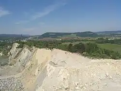 The Langenberg chalk quarry exposes a nearly continuous, 203 m (666 ft) thick succession of carbonate rocks[1] belonging to the Süntel Formation, that ranges in age from the early Oxfordian to late Kimmeridgian stages and have been deposited in a shallow sea with a water depth of less than 30 m (98 ft). The layers exposed in the quarry are oriented nearly vertically and slightly overturned, which is a result of the ascent of the adjacent Harz mountains during the Lower Cretaceous. Widely known as a classical exposure among geologists, the quarry had been extensively studied, and visited by students of geology for decades.