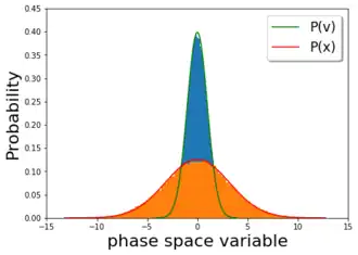 A particle in a fluid is described by a Langevin equation with a potential energy function, a damping force, and thermal fluctuations given by the fluctuation dissipation theorem. If the potential is quadratic then the constant energy curves are ellipses, as shown in the figure. If there is dissipation but no thermal noise, a particle continually loses energy to the environment, and its time-dependent phase portrait (velocity vs position) corresponds to an inward spiral toward 0 velocity. By contrast, thermal fluctuations continually add energy to the particle and prevent it from reaching exactly 0 velocity. Rather, the initial ensemble of stochastic oscillators approaches a steady state in which the velocity and position are distributed according to the Maxwell–Boltzmann distribution. In the plot below (figure 2), the long time velocity distribution (blue) and position distributions (orange) in a harmonic potential () is plotted with the Boltzmann probabilities for velocity (green) and position (red). In particular, the late time behavior depicts thermal equilibrium.