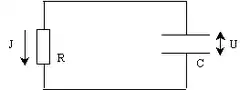 There is a close analogy between the paradigmatic Brownian particle discussed above and Johnson noise, the electric voltage generated by thermal fluctuations in a resistor.[9] The diagram at the right shows an electric circuit consisting of a resistance R and a capacitance C. The slow variable is the voltage U between the ends of the resistor. The Hamiltonian reads , and the Langevin equation becomes