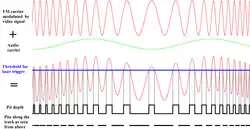 LaserDiscs stored analog video using a composite signal format, offering picture quality comparable to the 1-inch (25 mm) Type C videotape format, with approximately 425 to 440 horizontal lines of resolution. A carrier frequency was modulated by the video signal, and this signal was physically represented by the pattern of pits and lands on the disc. During playback, a laser read these patterns, enabling the player's circuitry to reconstruct the original analog signal.