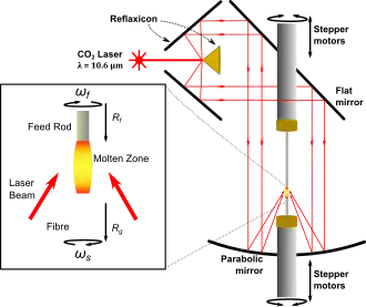 An improvement to the laser-heated crystal growth technique was made by Fejer et al.,[13] who incorporated a special optical component known as a reflaxicon, consisting of an inner cone surrounded by a larger coaxial cone section, both with reflecting surfaces. This optical element converts the cylindrical laser beam into a larger diameter hollow cylinder surface.[14] This optical component allows radial distribution of the laser energy over the molten zone, reducing radial thermal gradients. The axial temperature gradient in this technique can go as high as 10000 °C/cm, which is very high when compared to traditional crystal growth techniques (10–100 °C/cm).