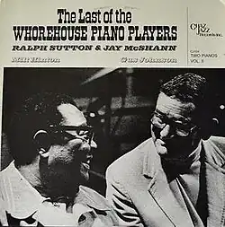 Last of the Whorehouse Piano Players, subtitled The Original Sessions is an album by pianists Ralph Sutton and Jay McShann, recorded in 1979 and originally released by the Chaz Jazz label as two LPs (subtitled Two Pianos Vol. I & II) before being reissued with two additional unreleased tracks by the Chiaroscuro label in 1992.[1][2] The 1992 CD reissue omitted two tracks from Two Pianos Vol. II, "I'll Catch The Sun" which was a solo feature for Jay McShann and "Ain't Misbehavin'" which Ralph Sutton played solo.[3] Another CD of 1989 recordings by the same group with the same title was released by Chiaroscuro on CD as Last of the Whorehouse Piano Players.