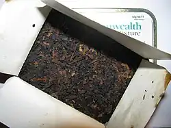 Latakia tobacco (Arabic: تبغ اللاذقية) is a sun-dried and smoke-cured tobacco product. It originated in Syria and is named after its major port city of Latakia, though large production has permanently moved to Cyprus due to varying and compounding sociopolitical issues within Syrian borders. It is in the family of fire-cured tobaccos in which the leaves are dried (cured) over burning hardwood. What sets Latakia apart from other fire-cured tobaccos is the use of heavy volumes of smoke from both dried and live material from aromatic woods.