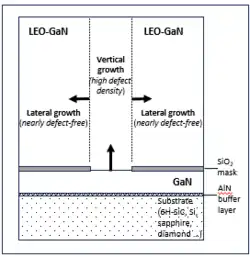 LEO involves growing a seed GaN layer of the material on a substrate, then etching a patterned mask on the surface of the seed layer, commonly silicon dioxide or silicon nitride, leaving some GaN seed windows exposed that act as crystallographic template for the subsequent growth of the GaN layer (Figure 1). The new LEO film grows simultaneously from the GaN windows both vertically and at the same time extends laterally over the mask, forming wings of much lower density of structural defects (mostly treading dislocations). The wings can merge together to form a continuous GaN film, or remain separated by seams.[9] Notably LEO process drastically reduces the defects in the crystal structure of the laterally grown areas by filtering them out at the mask interface. LEO can be performed from the vapor phase, depending on the material and the growth conditions via epitaxial growth techniques such as metalorganic vapour-phase epitaxy (MOCVD) or hydride vapour-phase epitaxy (HVPE).