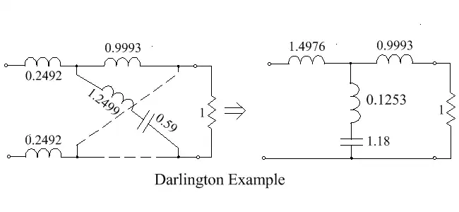 The lattice is a balanced configuration which is not suitable for some applications. In such cases it is necessary to convert the circuit to an electrically equivalent unbalanced form. This provides benefits, including reduced component count and relaxed circuit tolerances. The simple conversion procedure shown in the previous section can only be applied in a limited set of conditions – generally, some form of bridged-T circuit is necessary. Many of the conversions require the inclusion of a 1:1 ideal transformer,[14] but there are some configurations which avoid this requirement, and one example is shown below.