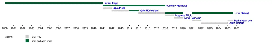 44. ^ "Zināms, kas komentēs 'Eirovīzijas' tiešraides" [It is known who will commentate on 'Eurovision' live]. Delfi (in Latvian). 27 April 2017. Retrieved 24 February 2020.