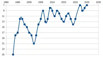 They have played at the top division of the tournament seven times; it has been at the top division since the 2022 tournament, where Latvia was called up to replace Russia in the rescheduled tournament due to the country being banned from international ice hockey (Latvia had originally been promoted for 2023). During the tournament, Latvia won its first-ever preliminary round game in the top division.[1] In the 2025 edition of the tournament, the Latvians had a major upset win over Canada, regarded as one of the best upsets in the history of the tournament.