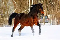 The Latvian Horse (Latvian: Latvijas šķirne or Latvijas zirgi) is a purpose-bred warmblood horse breed from Latvia. Breeding began in Latvia in the early twentieth century,[2]: 316 and a herd book was established in 1927.[4] The breed was officially recognised in 1952. There are two types, sometimes called the Latvian Harness Horse[3] and the Latvian Riding Horse.[6]: 276 The harness type was predominant until about 1960, when demand for sport horses increased and more of the saddle type were bred.[2]: 316