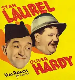 Stan Laurel (1890–1965) and Oliver Hardy (1892–1957) were established as film comedians prior to their teaming, with Laurel appearing in over 50 silent films and Hardy in over 250. (Hardy also appeared in three sound features without Laurel.)[3] Although they first worked together in the film The Lucky Dog (1921), this was a chance pairing and it was not until 1926 when both separately signed contracts with the Hal Roach film studio that they appeared in film shorts together.[4] Laurel and Hardy officially became a team the following year with their 11th silent short film, The Second Hundred Years (1927).[5] The pair remained with the Roach studio until 1940.[6] Between 1941 and 1945, they appeared in eight features and one short for 20th Century Fox and Metro-Goldwyn-Mayer.[7] After finishing their film commitments, Laurel and Hardy concentrated on stage shows, embarking on a music hall tour of Great Britain.[8] In 1950, they appeared in their last film, Atoll K, a French/Italian co-production.[9]