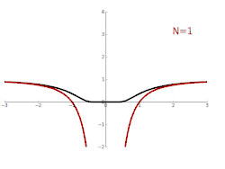 Consider for instance the function with . As a real function, it is infinitely differentiable everywhere; as a complex function however it is not differentiable at . The Laurent series of is obtained via the power series representation, which converges to for all except at the singularity . The graph on the right shows in black and its Laurent approximations As , the approximation becomes exact for all (complex) numbers except at the singularity .