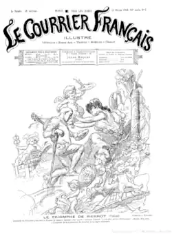 Under the direction of Jules Roques, Le Courrier français became the most representative satirical organ of the time.[2] Notable writers included Maurice Bouchor, Raoul Ponchon, Georges Montorgueil, Hugues Delorme and Jean Lorrain. Illustrators included Adolphe Willette, David Ossipovitch Widhopff, Jean-Louis Forain, Jules Chéret, Hermann-Paul, Henri Pille and Pierre Jeannot.[2] The magazine included sections on literature, fine arts, theater, medicine and finance.
