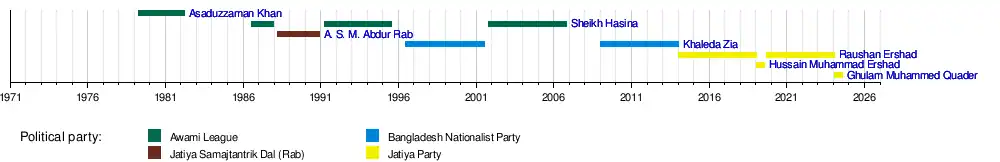 The Leader of the Opposition (Bengali: বিরোধীদলীয় নেতা) leads the Official Opposition in the Jatiya Sangsad, the national parliament of Bangladesh. The Leader of the Opposition is the leader of the largest political party in the Jatiya Sangsad that is not in government. That is usually the leader of the second largest political party in the Jatiya Sangsad.[1]