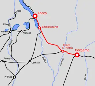 The section from Lecco to Calolziocorte has also been used by the Lecco–Milan railway since 1873.[6] The Bergamo–Ponte San Pietro section has also used been by the Seregno-Bergamo line since the completion of the Carnate–Ponte San Pietro section in 1889.