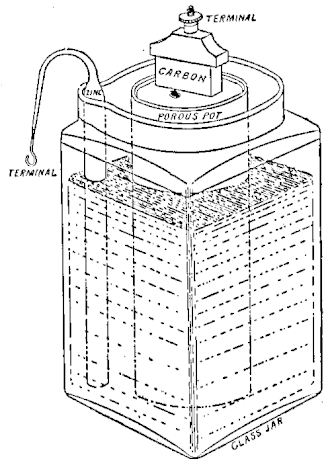 - In this cell the porous pot is replaced by a wrapping of canvas or sacking. In addition, the zinc rod is replaced by a zinc cylinder to give a larger surface area. It has a lower internal resistance than either of the above (porous and agglomerate).