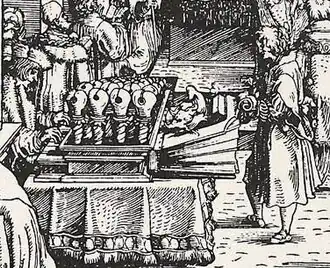 In addition to maps, other astrological, geometrical and horological instruments were also developed, chiefly by Stiborius and Stabius, who understood the need to cooperate with the emperors to make these instruments into useful tools for propaganda also.[248][249] The extraordinarily luxurious planetarium, that took twelve men to carry and was given as a diplomatic gift by Ferdinand I to Suleiman the Magnificent in 1541, originally belonged to Maximilian.[250][251] He loved to introduce newly invented musical instruments.[252][253] In 1506, he had a special regal, likely the apfelregal seen in one of Hans Weiditz's woodcuts, built for Paul Hofhaimer.[254][255] The emperor's favourite musical instrument maker was Hans Georg Neuschel of Nuremberg, who created an improved trombone (Neuschel was a talented trombonist himself).[256][257] In 1500, an elaborated lathe (Drehbank) was created for the emperor's personal carpentry hobby. This is the earliest extant lathe, the earliest known surviving lapidary instrument as well as one of the earliest examples of scientific and technological furniture.[258] The earliest surviving screwdriver has also been found attached to one of his suits of armour.[259] Regiomontanus reportedly made an eagle automaton that moved and greeted him when he came to Nuremberg.[260] Augsburg also courted "their" emperor by building the legendary Nachttor or Night Gate (famous for its many secret mechanisms), intended to make his entrance safer if he returned to the city at night, in 1514. The gate was destroyed in 1867, but plans and descriptions remain so recently Ausburg has created a virtual version.[261][262][263] He liked to end his festivals with fireworks. In 1506, on the surface of Lake Konstanz, on the occasion of the gathering of the Reichstag, he staged a show of firework (this was the first recorded German firework, inspired by the example of Italian princes), completed with firework music provided by singers and court trumpeters. Machiavelli judged him as extravagant, but these were not fireworks done for pleasure, peaceful celebration or religious purpose as the type often seen in Italy, but a core ritual of Maximilian's court, that demonstrated the link between pyrotechnics and military technology. The show caused a stir (the news about the event was distributed through a Briefzeitung, or "letter newspaper"), leading to fireworks becoming fashionable. In the Baroque era, it would be a common form of self-stylization for monarchs.[264][265][266][267]