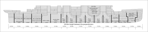 The Titanic was designed to comply with the Grade 1 subdivision proposed by the 1891 Bulkhead Committee, meaning that it could stay afloat with any two adjoining out of its 16 main compartments open to the sea. The height of the bulkhead deck above the water line in flooded condition was well above the requirements, and the vessel would have been able to float with 3 adjoining compartments flooded in 11 of 14 possible combinations.[6] The subdivisions could be sealed from communication with each other with cast iron watertight doors. To somewhat lower the chance of a sailor being caught in them, a geared system dropped the doors gradually, over 25 to 30 seconds, by sliding them vertically on hydraulic cataract cylinders.[7]