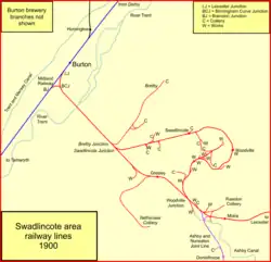 The Leicester–Burton upon Trent line is a freight-only railway line in England linking the Midland Main Line near Leicester to the Derby to Birmingham line at Burton upon Trent.[a] The line was built by the Midland Railway, which had acquired the Leicester and Swannington Railway in 1847, improving it and extending it. It opened throughout in 1849. The line connected an exceptional number of collieries and industrial premises, and several industrial branch lines were built radiating from it. Swadlincote was already an established community engaged in industry and there was a complex of branch lines there. The passenger service on the line was discontinued in 1964, and much of the mining-based industry has closed down; quarrying is the dominant residual originating traffic. There are proposals to reopen the passenger service, and these are under review at present (2022).