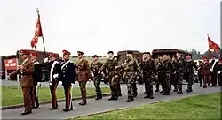The regiment was formed by the amalgamation of the Leicestershire Yeomanry and the Derbyshire Yeomanry in 1957.[2] The regiment was re-roled as infantry in 1967, with four squadrons.[2] In 1969 it was reduced to a cadre.[2] The cadre paraded its Guidon at Catterick Garrison later that year and was expanded to squadron strength as the Leicestershire and Derbyshire (Prince Albert's Own) Yeomanry Squadron, 7th Battalion, the Royal Anglian Regiment in 1971.[2]