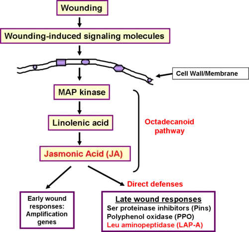 In order to survive, plants must be able to respond to many biotic and abiotic stresses, including pathogen attack, piercing/sucking insects, herbivory, and mechanical wounding. These stresses activate specialized signal transduction pathways, which are specific to the stressor and the amount of tissue damage inflicted. Similar to mechanical wounding, chewing insects, such as the tobacco hornworm (Manduca sexta, one of the major pests of tomato), cause extensive tissue damage activating the jasmonic acid (JA)-mediated response (Walling 2000). This JA-mediated response revolves around the octadecanoid pathway, which is responsible for the synthesis of JA and several other potent signaling molecules, and ends in the regulation of two sets of genes whose expression changes over time. The early genes amplify the wounding signal and can be detected 30 minutes to 2 hours after damage (Ryan 2000). Late gene expression can be seen 4–24 hours after wounding. Products of late-response genes act as deterrents to chewing-insect feeding, often by decreasing the nutritional value of the food ingested or interfering with insect gut function (Walling 2000). For example, serine proteinase inhibitors (Pins) interfere with digestive proteases in the insect gut and polyphenol oxidases (PPO) act to decrease the nutritive value of plant leaves after ingestion by herbivores (Johnson et al. 1989; Ryan 2000; Orozco-Cardenas 2001). Please see the Picture 3 for a summary of the wound response in tomato.