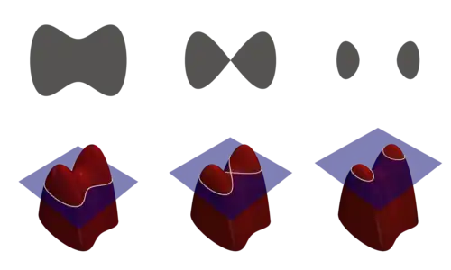 In the top row, the shape's topology changes as it is split in two. It is challenging to describe this transformation numerically by parameterizing the boundary of the shape and following its evolution. An algorithm can be used to detect the moment the shape splits in two and then construct parameterizations for the two newly obtained curves. On the bottom row, however, the plane at which the level set function is sampled is translated upwards, on which the shape's change in topology is described. It is less challenging to work with a shape through its level-set function rather than with itself directly, in which a method would need to consider all the possible deformations the shape might undergo.