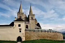 The old medieval town of the Levoča (Hungarian: Lőcse, German: Leutschau) is still surrounded by most of its 2,5 km long city walls. The main entrance to the old town is via the monumental Košice Gate, with the other two preserved namely Menhard, and the Polish Gate. The town square boasts three major monuments: