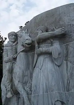 Leo Friedlander's Lewis and Clark (1934) is a high relief carving depicting Meriwether Lewis and William Clark of the Lewis and Clark Expedition on horseback, being led by Sacajawea, located outside the Oregon State Capitol's main entrance.[1] The white Vermont marble sculpture, carved from a block made of six smaller pieces, measures approximately 153 inches (3.9 m) x 18.5 inches (0.47 m) x 8 feet (2.4 m) and rests on a granite base that measures approximately 51 inches (1.3 m) x 19.5 feet (5.9 m) x 90 inches (2.3 m).[1] On the back is a map illustrating the area covered by Lewis and Clark and depictions of both hunting and meetings with Native Americans. The installation also includes a signed inscription that reads "LEO FRIEDLANDER" on the lower left and "WESTWARD THE STAR OF EMPIRE TAKES ITS WAY" across the base.[1]