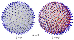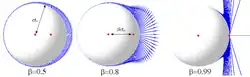 Electromagnetic field (arbitrary unit) of a positive point charge moving at constant speed. When , the electromagnetic field reduces to electrostatic field (in blue). Due to its insignificance at large distance, this field is ignored in high energy physics when computing electromagnetic radiation power. However, it is used for wakefield modeling. The Coulomb field is also known as pancake field when .[5][6]Electromagnetic field (arbitrary unit) of a positive accelerated point charge (far from the source). Acceleration is parallel to velocity. When the particle decelerates, this leads to braking radiations which can be strong when particles collide.Electromagnetic field (arbitrary unit) of a positive accelerated point charge (far from the source). Acceleration is perpendicular to velocity. It is the synchrotron radiation.