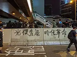 Some protesters who went to the Liaison Office on 21 July 2019 considered the actions that night to be a revolution, reusing the slogan "Liberate Hong Kong, revolution of our times" for the protests.[72] The slogan has been used by some candidates in the 2019 District Council elections. A number of candidates who used the slogan in Facebook posts, including Tommy Cheung, Liu Qing and Billy Chan Shiu-yeung, received letters from Returning Officers questioning the meaning of the slogan. In his publicly published response, Cheung stated that "liberate Hong Kong" referred to a return of Hong Kong to an era when citizens enjoyed various freedoms, whereas "revolution of our times" referred to a need for large social changes rather than a movement to overturn the regime.[73]