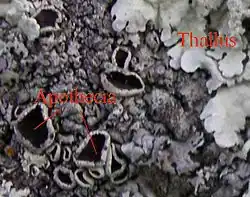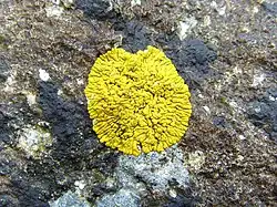 The thallus is not always the part of the lichen that is most visually noticeable. Some lichens can grow inside solid rock between the grains (endolithic lichens), with only the sexual fruiting part visible growing outside the rock.[35] These may be dramatic in color or appearance.[35] Forms of these sexual parts are not in the above growth form categories.[35] The most visually noticeable reproductive parts are often circular, raised, plate-like or disc-like outgrowths, with crinkly edges, and are described in sections below.