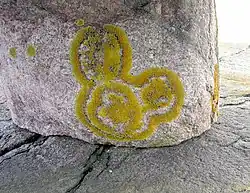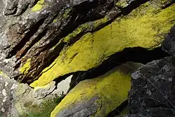 Different colored lichens may inhabit different adjacent sections of a rock face, depending on the angle of exposure to light.[40] Colonies of lichens may be spectacular in appearance, dominating much of the surface of the visual landscape in forests and natural places, such as the vertical "paint" covering the vast rock faces of Yosemite National Park.[41]