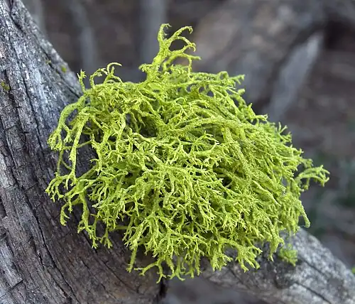 Lichens come in many colors.[15]: 4  Coloration is usually determined by the photosynthetic component.[34] Special pigments, such as yellow usnic acid, give lichens a variety of colors, including reds, oranges, yellows, and browns, especially in exposed, dry habitats.[40] In the absence of special pigments, lichens are usually bright green to olive gray when wet, gray or grayish-green to brown when dry.[40] This is because moisture causes the surface skin (cortex) to become more transparent, exposing the green photobiont layer.[40] Different colored lichens covering large areas of exposed rock surfaces, or lichens covering or hanging from bark can be a spectacular display when the patches of diverse colors "come to life" or "glow" in brilliant displays following rain.