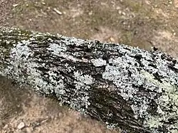 When a crustose lichen gets old, the center may start to crack up like old-dried paint, old-broken asphalt paving, or like the polygonal "islands" of cracked-up mud in a dried lakebed. This is called being rimose or areolate, and the "island" pieces separated by the cracks are called areolas.[35] The areolas appear separated, but are (or were) connected by an underlying prothallus or hypothallus.[38] When a crustose lichen grows from a center and appears to radiate out, it is called crustose placodioid. When the edges of the areolas lift up from the substrate, it is called squamulose.[39]: 159 [37]