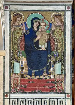 A mosaic of the Blessed Virgin Mary, the church's patron saint, inside the church. The choice of Mary as the patron saint was intended to emphasise the distinction between Catholicism and other denominations.