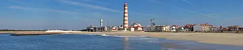 The Lighthouse of Praia da Barra, also known as the Aveiro Lighthouse (Portuguese: Farol de Aveiro/Farol da Praia da Barra), is an active lighthouse in the civil parish of Gafanha da Nazaré, municipality of Ílhavo, in the Portuguese district of Aveiro. Situated on the coastal Praia da Barra, at the southern margin of the Ria de Aveiro, it is the tallest lighthouse in Portugal, with a height of 203 feet (62 m)[2] overseeing the barrier beach and exposed to Atlantic storms. It is open to the public and visits are held on Wednesdays from 14:00 to 17:00.