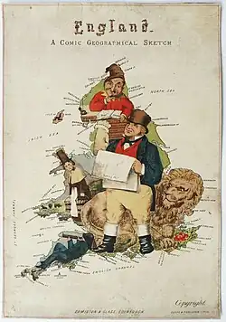 'England. A Comic Geographical Sketch', map by Lancaster featuring John Bull reading The Times, a recumbent lion, Mr Punch and a Welsh woman in her traditional stove-pipe hat (1878)
