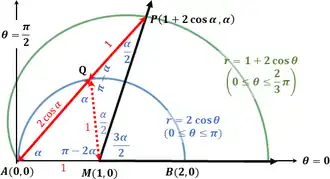 The construction of the outer loop of reveals its angle trisection properties.[5] The outer loop exists on the interval . Here, we examine the trisectrix property of the portion of the outer loop above the polar axis, i.e., defined on the interval .