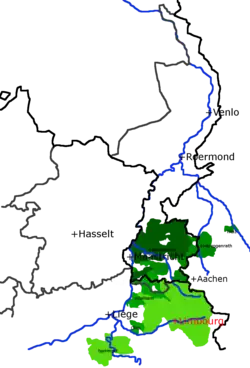 Map showing the medieval "lands of Overmaas" and the Duchy of Limburg, both in the Middle Ages possessed by the Dukes of Brabant. Together these two counties formed one province in the Seventeen Provinces. (The dark lines are the modern borders).