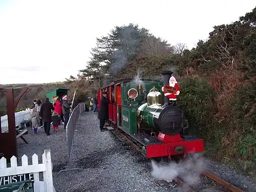 In conjunction with the railway's Santa trains each December the station is renamed North Pole Halt and is transformed into a waiting area, serving as the line's temporary terminus for the running days (the headland section is not used as it is exposed to possible inclement weather). Festoon lighting is erected, and a large temporary canopy provided as shelter for passengers, and the area suitably fenced to provide a queuing area for waiting passengers. So, despite being one of the quietest stations on the island generally, for four days each December it is transformed into one of the island's busiest.