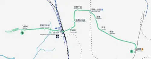 Line 9 of the Guangzhou Metro is a rapid transit line running across the Huadu District. It starts at Fei'eling and ends at Gaozeng. Its only interchange is with Line 3 at Gaozeng. The total length is 20.1 km (12.49 mi) with 11 stations. Line 9's color is pale green. Line 9 was opened for operation on 28 December 2017. [2]