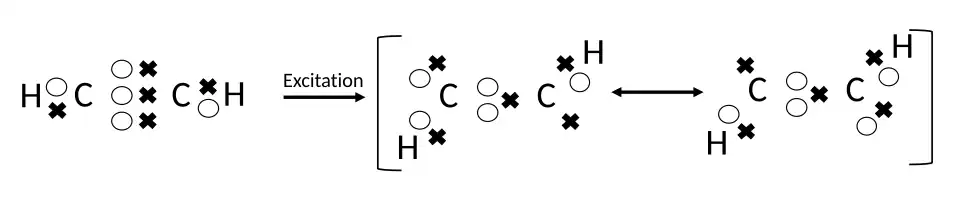 Linnett also used the example of acetylene to illustrate the power of the LDQ approach for understanding the structures of the excited states of molecules.[2] The dot-and-cross diagrams for both the ground state and the first excited state of acetylene are shown below.