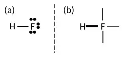 Further, Linnett also modified the lines used in Lewis structures to account for electron coincidence and/or non-coincidence: a thin line represents an electron pair that is not close-paired, while a thick line represents a close-pair of electrons. This is exemplified best in the case of the hydrogen fluoride molecule, the dot-and-cross diagram of which is shown on the right. Here, the Lewis structure drawn on the left of the image is compared with the LDQ line structure on the right of the image. The LDQ structure thus expands on the Lewis structure by denoting if the electrons are coincident (thick line) or if they are spatially separated (thin lines).