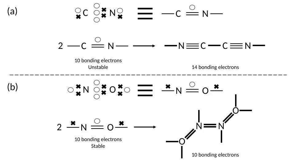 Hence, the dimerisation of CN to cyanogen is favourable as it increases the degree of bonding in the overall system and reduces the total energy. In contrast, the NO molecule is a type (b) radical, also with ten electrons. However, the dimeric N2O2 molecule likewise has ten bonding electrons, and hence there is no significant energetic benefit from the formation of the dimer. In fact, the formation of the nitrogen-nitrogen bond leads to an increase in the number of close-paired electrons and hence an increase in the total system energy, and so isolated NO molecules are stable against dimerisation in the gas phase.[2]