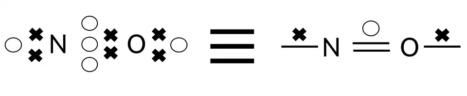 Additionally, by adding a dot or cross above/below the bond line, one can denote an odd number of electrons which are involved in the bond. This is illustrated well in the structure of nitric oxide (NO) shown below: