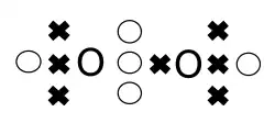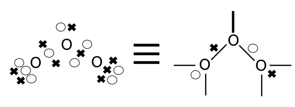 The above three-dimensional LDQ structures are useful for visualising the molecular structures, but they can be laborious to construct. Hence, Linnett introduced two-dimensional structures, analogous to Lewis structures, that used dots and crosses to represent the relative spin states of electrons. An example is shown on the right for molecular oxygen.