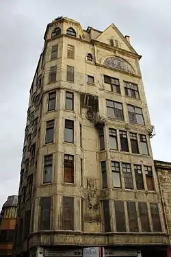 The Lion Chambers is a building in the city centre of Glasgow, Scotland which began construction in 1904 and was completed in 1907. It was designated as a Category A listed building in 1966.[1] It still stands today despite it recently being abandoned due to structural weakness. The building features stonework on the exterior showing a lion's head referencing the name, as well as the upper bodies of some Judges of the court, since the building was intended to comprise mainly lawyers' offices. It was made using a somewhat experimental method of construction called the Hennebique System which involves a reinforced concrete as its main material; the technique has fallen out of favour in modern times. Whether or not the building will be demolished or receive funding to be refurbished remains to be seen.