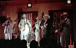 The Blue Grass Boys were the backing band for bluegrass mandolinist Bill Monroe. Active from 1938 until Monroe's death in 1996, the group are cited as one of the earliest and most influential groups of the bluegrass genre, which takes its name from the band's moniker.[1] Over its 58-year tenure, the Blue Grass Boys included over 150 members, as well as numerous additional stand-in and guest musicians, many of whom have since been inducted into the International Bluegrass Music Hall of Fame and/or Country Music Hall of Fame. At the time of their first recording in 1939, the group's lineup featured guitarist Cleo Davis, fiddler Art Wooten and bassist Walter "Amos" Garren;[2] at the time of their first release in 1940, Monroe was backed by guitarist Clyde Moody, fiddler Tommy Magness and bassist Bill "Cousin Wilbur" Wesbrooks.[3] The final lineup of the band featured guitarist Tom Ewing, banjoist Dana Cupp, fiddlers Robert Bowlin and Clarence "Tater" Tate, and bassist Ernie Sykes.[4] Monroe died on September 9, 1996, at the age of 84.[5]